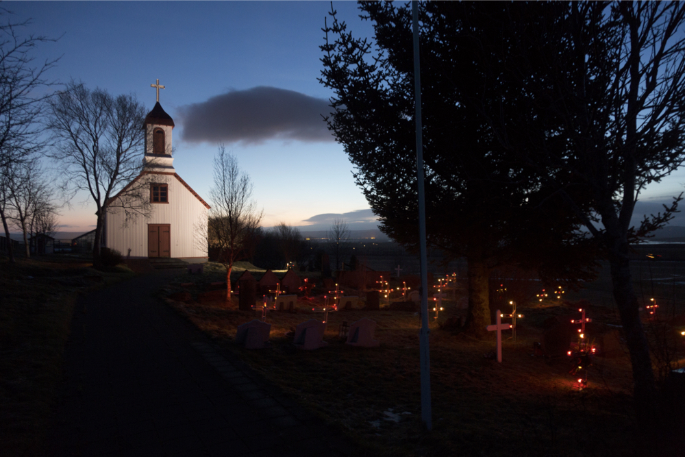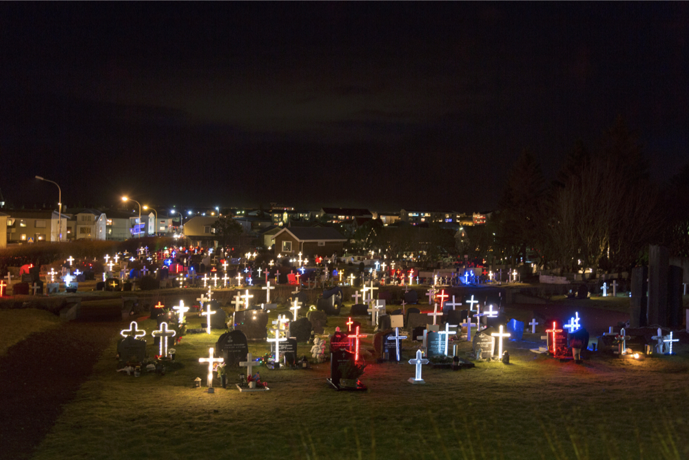Beleuchtete Grabkreuze bei Skálholt
